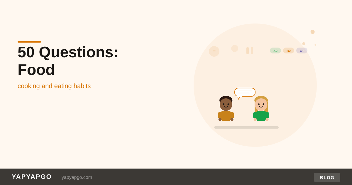 YapYapGo includes food and lifestyle as discussion topics across its speaking modes, with questions matched to age group and CEFR level. But these work just as well read aloud.A2 Elementary (questions 1–10)