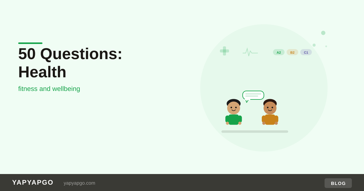 YapYapGo is a free speaking practice tool for ESL classrooms that includes health and lifestyle as a discussion topic category, with questions matched to age and level. For tips on keeping conversations going once they start, check out what to do when students run out of things to say.A2 Elementary (questions 1–10)