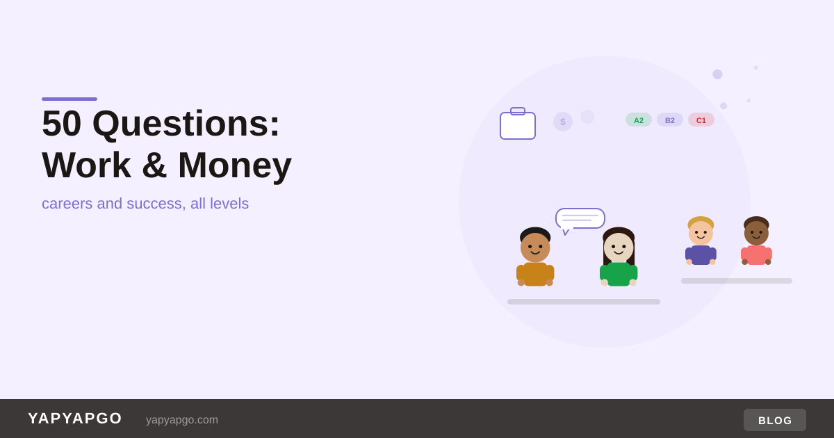 Here are 50 discussion questions organised by CEFR level, designed for pair work. YapYapGo is a free classroom speaking practice tool for ESL teachers that includes work and careers as one of its discussion topic categories, with questions matched to age group and CEFR level. But these work just as well projected on a board. For more on how to structure pair discussions, see our post on reducing teacher talking time.