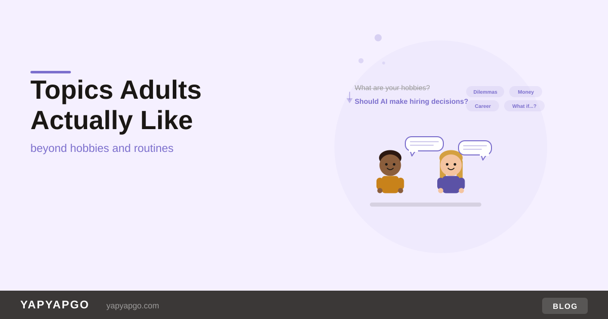 These questions aren't bad. They're just boring - at least for adults who've answered them a hundred times across a dozen English courses. Adult learners don't need safe, predictable topics. They need topics that make them want to talk. That's why tools like YapYapGo filter questions by age group, so adults get adult-relevant content rather than recycled textbook prompts.