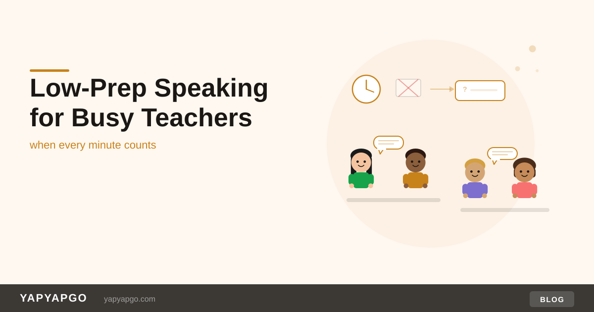 If you're teaching 20+ hours a week, you can't prep elaborate speaking activities for every class. But you can build a habit: every lesson starts with five minutes of pair discussion on a single question. No prep needed. Five minutes per lesson, five lessons per day, five days per week = 125 minutes of additional student speaking time per week that costs you zero preparation.