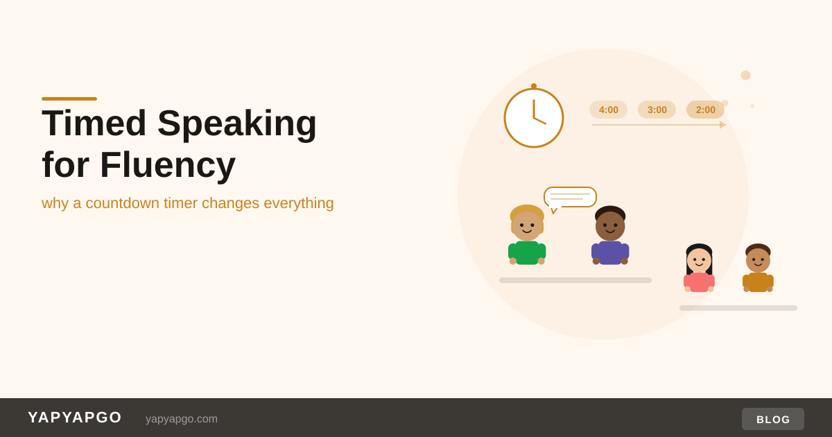 When students speak without any time constraint, they tend to do something called "monitoring" — mentally checking every sentence for accuracy before saying it. This is useful when writing an essay. It's disastrous for conversation, because real communication happens at speed.